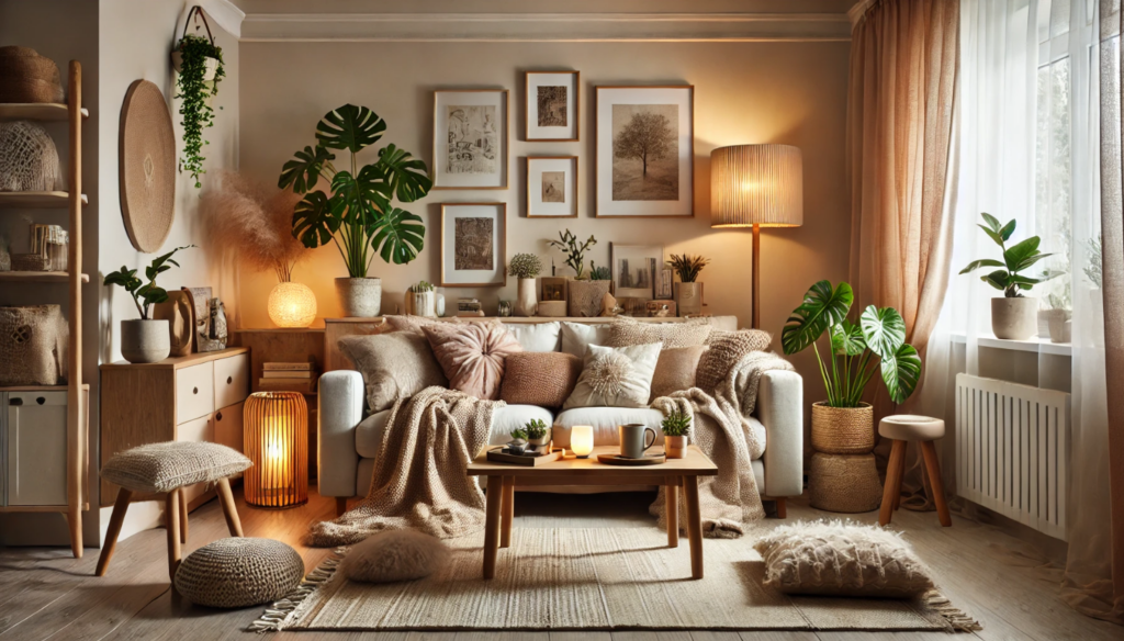 Pri vankúšoch a dekách je v poriadku kombinovať rôzne textúry, vzory a veľkosti. Závesy dokážu priestor zjemniť a dodať pocit súkromia. Miestnosť presvetlíte ak zvolíte svetlejšie farby, naopak, ak chcete mať možnosť miestnosť zatemniť, zvoľte tmavšie farby závesov. Koberec je taktiež ideálnym prvkom pre zútulnenie a pohodlie v obývačke, či v spálni.
